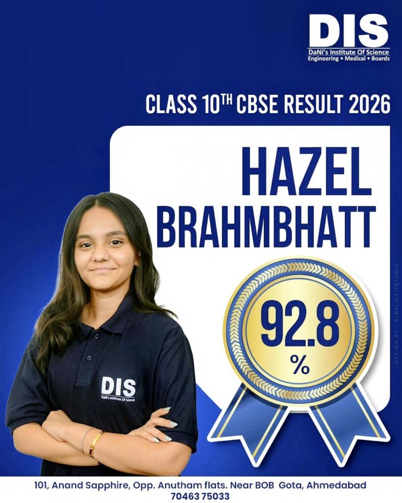 અમદાવાદ. ઘાટલોડિયાની કેલોરેક્સ ફ્યુચર સ્કૂલમાં અભ્યાસ કરતી હેઝલ બ્રહ્મભટ્ટ, જે ધર્મ અને કીર્તિકા બ્રહ્મભટ્ટની પુત્રી છે, તેણે તાજેતરમાં જાહેર થયેલા SSC CBSE બોર્ડના પરીક્ષાફળમાં 92.80% ગુણ પ્રાપ્ત કર્યા છે l નિયમિત અભ્યાસમાં વિશ્વાસ રાખનાર હેઝલે પોતાની મહેનત, સમર્પણ અને દૃઢ નિશ્ચયથી ઉત્તમ પરિણામ મેળવ્યું છે, જે તેના ઉજ્જવળ અને શ્રેષ્ઠ ભવિષ્ય તરફનું પહેલું પગલું છે।